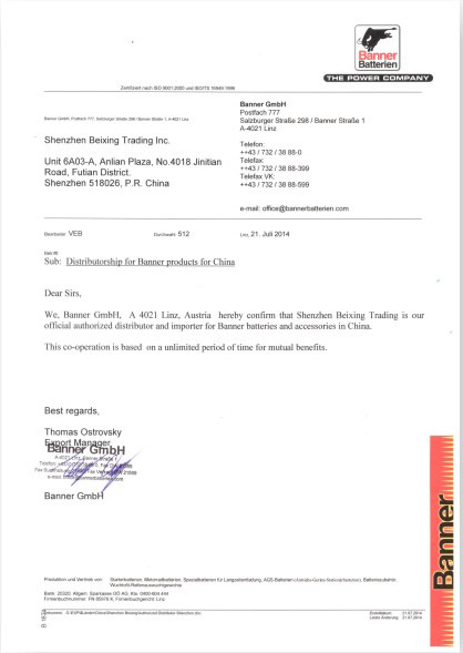 2014年7月21日,Bamner公司正式授权深圳市北星贸易有限公司为Banner中国区域代理,并颁发授权证书。